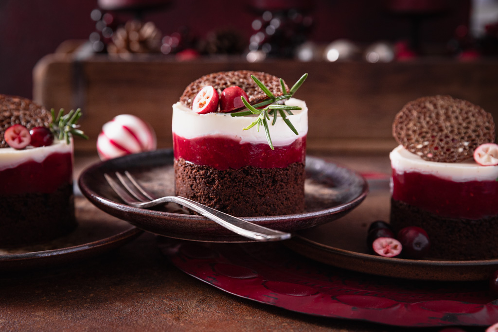 Hier kommt DAS Weihnachtstörtchen – happy Nikolaus!Was ist drin? Die Törtchen haben einen saftigen Brownie-Boden mit einem Hauch Weihnachtsaroma. Darauf macht es sich eine Schicht beeriges Püree bequem. Hierfür werden frische Cranberries mit Tiefkühlbeeren gemischt. Den krönenden Abschluss macht eine Schicht Panna Cotta mit wunderbarem Vanillearoma. Süß, fruchtig, cremig – bei diesem Törtchen ist alles…