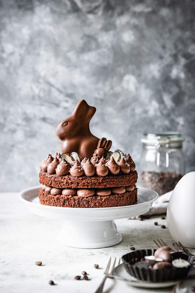 Ostern steht vor der Tür. Die Verabredungen mit der Familie stehen. Zeit sich nach einem Rezept für ein Dessert oder eine Leckerei für die Kaffeetafel umzusehen. Ich habe hier eine kleine Schoko-Torte mit Kaffeenote im Angebot, die sich toll am Nachmittag zum Kaffeetrinken machen würde oder auch als Dessert nach einem leckeren Ostermenü. Die Torte ist recht unkompliziert zu machen. Für die Böden wird ein Kuchen in einer Ø20cm Backform gebacken. Nach dem Auskühlen wird eine Schokocreme aus Mascarpone, Kakao und Kaffeelikör aufgespritzt. Dann ist das Törtchen auch schon fertig und kann nach Belieben dekoriert werden. Zu Ostern bieten sich natürlich allerlei Schoko-Leckereien an.