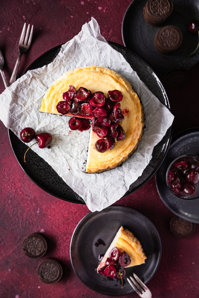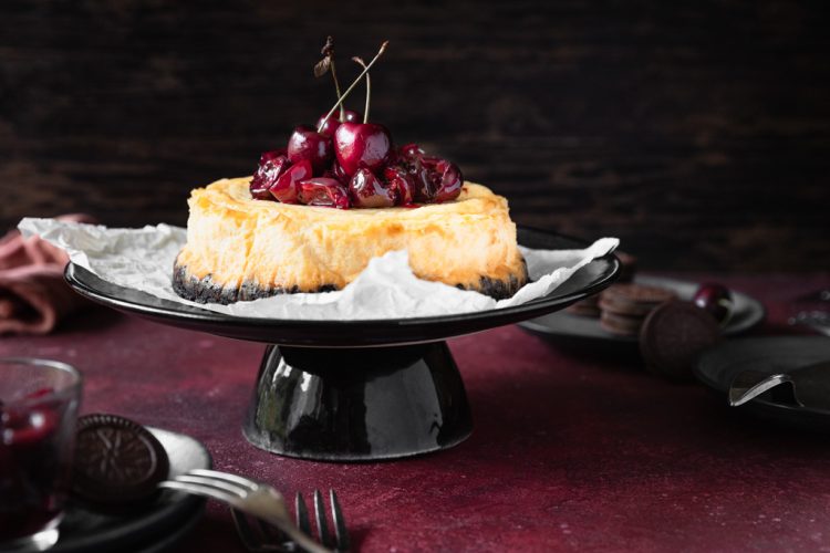 Inspiriert von einem echten Klassiker – der Schwarzwälder Kirschtorte – kommt dieser Cheesecake mit ganz ähnlichen Aromen, aber in völlig neuem Gewand daher. Statt Biskuit gibt’s einen dunklen Oreo-Keksboden, die Sahneschicht wird durch eine zartschmelzende Cheesecake-Creme ersetzt, und obendrauf landen geröstete Kirschen, die durch einen Schuss Marsala ein wunderbar intensives Aroma bekommen. Eine moderne, unkomplizierte Version des Traditionskuchens – perfekt für alle, die Schwarzwälder Kirsch lieben, aber mal etwas Neues ausprobieren möchten.
